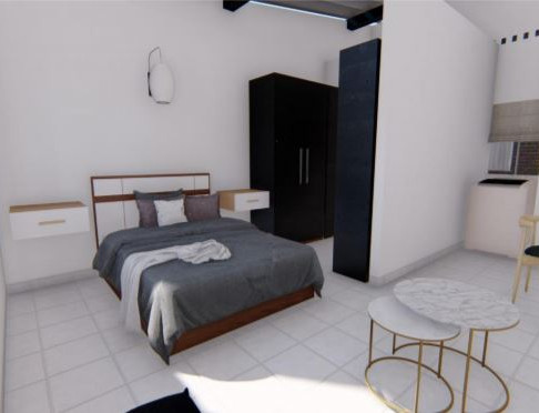 La disposición del aparta estudio se define con una zona de circulación, que compromete la zona de servicios en su acceso, con la zona social y visual en la fachada principal, compartida con la zona privada, permitiendo así la iluminación natural completa en todo el diseño.